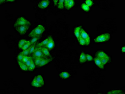 Immunofluorescence staining of HepG2 cells with CSB-PA012171LA01HU at 1:66, counter-stained with DAPI. The cells were fixed in 4% formaldehyde, permeabilized using 0.2% Triton X-100 and blocked in 10% normal Goat Serum. The cells were then incubated with the antibody overnight at 4°C. The secondary antibody was Alexa Fluor 488-congugated AffiniPure Goat Anti-Rabbit IgG(H+L).