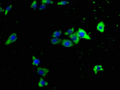 Immunofluorescence staining of HepG2 cells with CSB-PA839346HA01HU at 1:133, counter-stained with DAPI. The cells were fixed in 4% formaldehyde, permeabilized using 0.2% Triton X-100 and blocked in 10% normal Goat Serum. The cells were then incubated with the antibody overnight at 4°C. The secondary antibody was Alexa Fluor 488-congugated AffiniPure Goat Anti-Rabbit IgG(H+L).