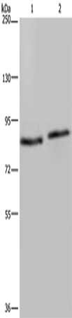 Gel: 6%SDS-PAGE, Lysate: 40 μg, Lane 1-2: 293T cells, K562 cells, Primary antibody: CSB-PA877324(ITGB2 Antibody) at dilution 1/600, Secondary antibody: Goat anti rabbit IgG at 1/8000 dilution, Exposure time: 3 minutes