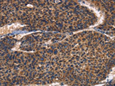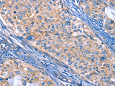 The image on the left is immunohistochemistry of paraffin-embedded Human liver cancer tissue using CSB-PA089157(ITGB3 Antibody) at dilution 1/30, on the right is treated with fusion protein. (Original magnification: ×200)