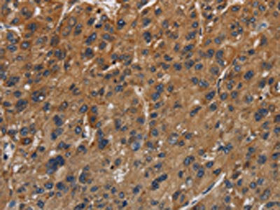The image on the left is immunohistochemistry of paraffin-embedded Human liver cancer tissue using CSB-PA588701(ITGB7 Antibody) at dilution 1/40, on the right is treated with synthetic peptide. (Original magnification: ×200)