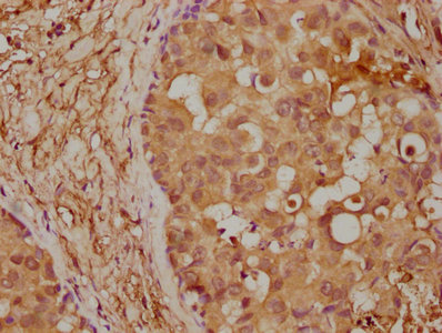 IHC image of CSB-PA4779A0Rb diluted at 1:400 and staining in paraffin-embedded human breast cancer performed on a Leica BondTM system. After dewaxing and hydration, antigen retrieval was mediated by high pressure in a citrate buffer (pH 6.0). Section was blocked with 10% normal goat serum 30min at RT. Then primary antibody (1% BSA) was incubated at 4°C overnight. The primary is detected by a biotinylated secondary antibody and visualized using an HRP conjugated SP system.