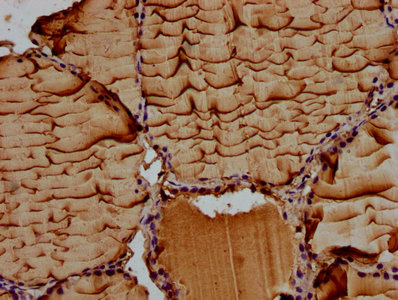IHC image of CSB-PA22869A0Rb diluted at 1:100 and staining in paraffin-embedded human thyroid tissue performed on a Leica BondTM system. After dewaxing and hydration, antigen retrieval was mediated by high pressure in a citrate buffer (pH 6.0). Section was blocked with 10% normal goat serum 30min at RT. Then primary antibody (1% BSA) was incubated at 4°C overnight. The primary is detected by a biotinylated secondary antibody and visualized using an HRP conjugated SP system.