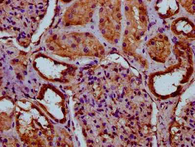 IHC image of CSB-PA22869A0Rb diluted at 1:100 and staining in paraffin-embedded human kidney tissue performed on a Leica BondTM system. After dewaxing and hydration, antigen retrieval was mediated by high pressure in a citrate buffer (pH 6.0). Section was blocked with 10% normal goat serum 30min at RT. Then primary antibody (1% BSA) was incubated at 4°C overnight. The primary is detected by a biotinylated secondary antibody and visualized using an HRP conjugated SP system.