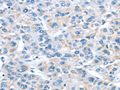 The image on the left is immunohistochemistry of paraffin-embedded Human liver cancer tissue using CSB-PA910876(ITPA Antibody) at dilution 1/30, on the right is treated with fusion protein. (Original magnification: ×200)