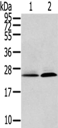 Gel: 12%SDS-PAGE,Lysate: 40 μg,Lane 1-2: Human fetal liver tissue, Hela cells,Primary antibody: CSB-PA910876(ITPA Antibody) at dilution 1/200 dilution,Secondary antibody: Goat anti rabbit IgG at 1/8000 dilution,Exposure time: 2 minutes