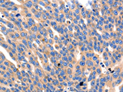 The image on the left is immunohistochemistry of paraffin-embedded Human ovarian cancer tissue using CSB-PA435870(JAK2 Antibody) at dilution 1/10, on the right is treated with synthetic peptide. (Original magnification: ×200)