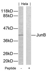 Western blot analysis of extracts from Hela cells using JunB(Ab-259) Antibody and the same antibody preincubated with blocking peptide.