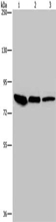 Gel: 6%SDS-PAGE, Lysate: 40 μg, Lane 1-3: Mouse skin tissue, HUVEC cells, Hela cells, Primary antibody: CSB-PA869662(JUP Antibody) at dilution 1/850, Secondary antibody: Goat anti rabbit IgG at 1/8000 dilution, Exposure time: 10 seconds