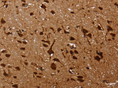 The image on the left is immunohistochemistry of paraffin-embedded Human brain tissue using CSB-PA163096(KARS Antibody) at dilution 1/60, on the right is treated with fusion protein. (Original magnification: ×200)