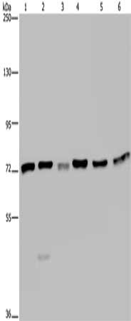 Gel: 6%SDS-PAGE, Lysate: 40 μg, Lane 1-6: K562 cells, A549 cells, HT29 cells, 293T cells, Hela cells, Jurkat cells, Primary antibody: CSB-PA163096(KARS Antibody) at dilution 1/350, Secondary antibody: Goat anti rabbit IgG at 1/8000 dilution, Exposure time: 20 seconds