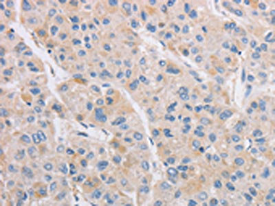 The image on the left is immunohistochemistry of paraffin-embedded Human liver cancer tissue using CSB-PA558670(KAT5 Antibody) at dilution 1/20, on the right is treated with fusion protein. (Original magnification: ×200)