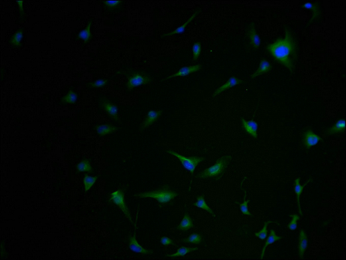 Immunofluorescence staining of U251 cells with CSB-PA619877LA01HU-IF at 1:100, counter-stained with DAPI. The cells were fixed in 4% formaldehyde and blocked in 10% normal Goat Serum. The cells were then incubated with the antibody overnight at 4°C. The secondary antibody was Alexa Fluor 488-congugated AffiniPure Goat Anti-Rabbit IgG(H+L).
