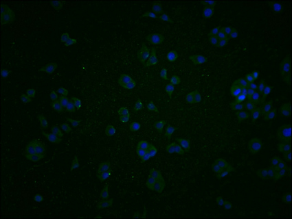 Immunofluorescence staining of PC3 cells with CSB-PA867147LA01HU at 1:200, counter-stained with DAPI. The cells were fixed in 4% formaldehyde and blocked in 10% normal Goat Serum. The cells were then incubated with the antibody overnight at 4°C. The secondary antibody was Alexa Fluor 488-congugated AffiniPure Goat Anti-Rabbit IgG(H+L).