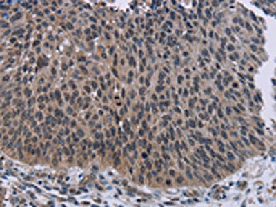 The image on the left is immunohistochemistry of paraffin-embedded Human lung cancer tissue using CSB-PA953461(KDM4D Antibody) at dilution 1/50, on the right is treated with fusion protein. (Original magnification: ×200)
