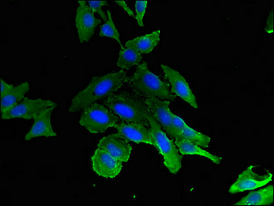 Immunofluorescent analysis of Hela cells using CSB-PA012307LA01HU at dilution of 1:100 and Alexa Fluor 488-congugated AffiniPure Goat Anti-Rabbit IgG(H+L)