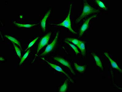 Immunofluorescence staining of Hela cells with CSB-PA836204LA01HU at 1:133, counter-stained with DAPI. The cells were fixed in 4% formaldehyde, permeabilized using 0.2% Triton X-100 and blocked in 10% normal Goat Serum. The cells were then incubated with the antibody overnight at 4°C. The secondary antibody was Alexa Fluor 488-congugated AffiniPure Goat Anti-Rabbit IgG(H+L).