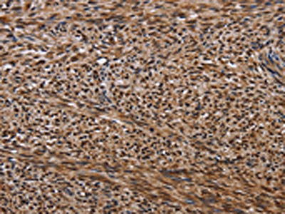 The image on the left is immunohistochemistry of paraffin-embedded Human sarcoma tissue using CSB-PA175695(KIF1C Antibody) at dilution 1/60, on the right is treated with fusion protein. (Original magnification: ×200)
