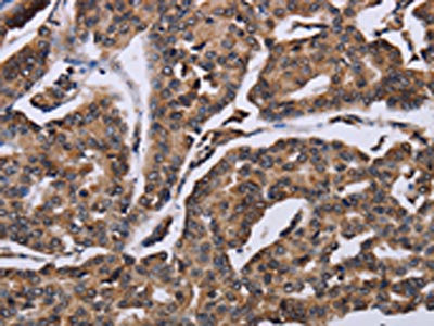 The image on the left is immunohistochemistry of paraffin-embedded Human breast cancer tissue using CSB-PA175695(KIF1C Antibody) at dilution 1/60, on the right is treated with fusion protein. (Original magnification: ×200)