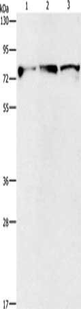 Gel: 8%SDS-PAGE, Lysate: 40 μg, Lane 1-3: Mouse brain tissue, human fetal brain tissue, human brain malignant glioma tissue, Primary antibody: CSB-PA236618(KIF3A Antibody) at dilution 1/500, Secondary antibody: Goat anti rabbit IgG at 1/8000 dilution, Exposure time: 1 second