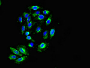 Immunofluorescent analysis of A549 cells using CSB-PA012360LA01HU at dilution of 1:100 and Alexa Fluor 488-congugated AffiniPure Goat Anti-Rabbit IgG(H+L)