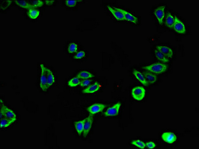 Immunofluorescent analysis of HepG2 cells using CSB-PA12729A0Rb at dilution of 1:100 and Alexa Fluor 488-congugated AffiniPure Goat Anti-Rabbit IgG(H+L)