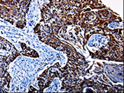 The image is immunohistochemistry of paraffin-embedded Human lung cancer tissue using CSB-PA554992(KLK3 Antibody) at dilution 1/25. (Original magnification: ×200)