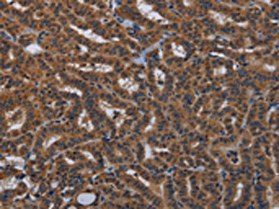The image on the left is immunohistochemistry of paraffin-embedded Human thyroid cancer tissue using CSB-PA228825(KLK8 Antibody) at dilution 1/50, on the right is treated with fusion protein. (Original magnification: ×200)