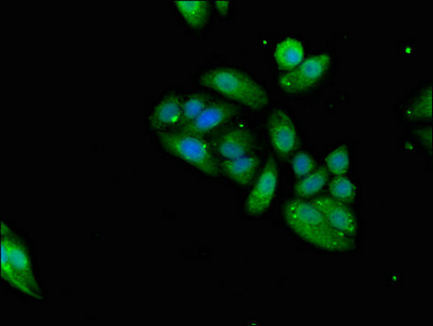 Immunofluorescent analysis of HepG2 cells using CSB-PA615672LA01HU at dilution of 1:100 and Alexa Fluor 488-congugated AffiniPure Goat Anti-Rabbit IgG(H+L)