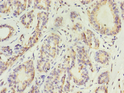 Immunohistochemistry of paraffin-embedded human breast cancer using CSB-PA012504LA01HU at dilution of 1:100