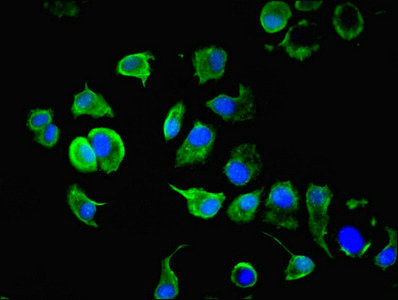 Immunofluorescent analysis of MCF-7 cells using CSB-PA012504LA01HU at dilution of 1:100 and Alexa Fluor 488-congugated AffiniPure Goat Anti-Rabbit IgG(H+L)