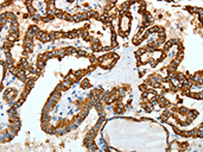 The image on the left is immunohistochemistry of paraffin-embedded Human thyroid cancer tissue using CSB-PA243997(KRT18 Antibody) at dilution 1/30, on the right is treated with fusion protein. (Original magnification: ×200)