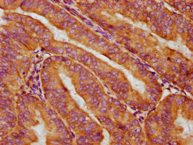 IHC image of CSB-PA012570LA01HU diluted at 1:400 and staining in paraffin-embedded human endometrial cancer performed on a Leica BondTM system. After dewaxing and hydration, antigen retrieval was mediated by high pressure in a citrate buffer (pH 6.0). Section was blocked with 10% normal goat serum 30min at RT. Then primary antibody (1% BSA) was incubated at 4°C overnight. The primary is detected by a biotinylated secondary antibody and visualized using an HRP conjugated SP system.