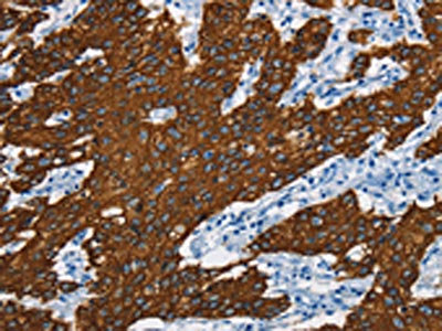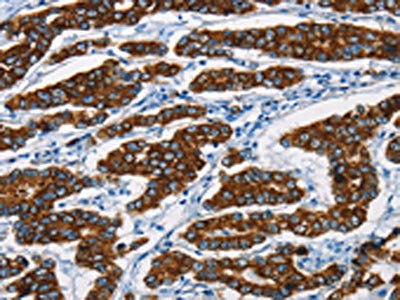 The image is immunohistochemistry of paraffin-embedded Human breast cancer tissue using CSB-PA579932(KRT8 Antibody) at dilution 1/20. (Original magnification: ×200)