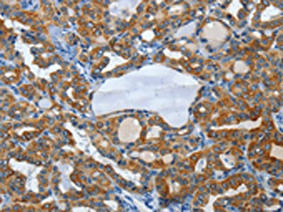 The image on the left is immunohistochemistry of paraffin-embedded Human thyroid cancer tissue using CSB-PA774709(KRT81 Antibody) at dilution 1/15, on the right is treated with fusion protein. (Original magnification: ×200)