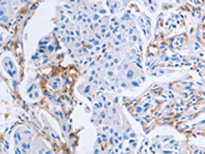 The image on the left is immunohistochemistry of paraffin-embedded Human lung cancer tissue using CSB-PA694004(LAIR1 Antibody) at dilution 1/25, on the right is treated with fusion protein. (Original magnification: ×200)