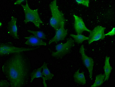 Immunofluorescence staining of U251 cells with CSB-PA621948LA01HU at 1:50, counter-stained with DAPI. The cells were fixed in 4% formaldehyde, permeabilized using 0.2% Triton X-100 and blocked in 10% normal Goat Serum. The cells were then incubated with the antibody overnight at 4°C. The secondary antibody was Alexa Fluor 488-congugated AffiniPure Goat Anti-Rabbit IgG(H+L).