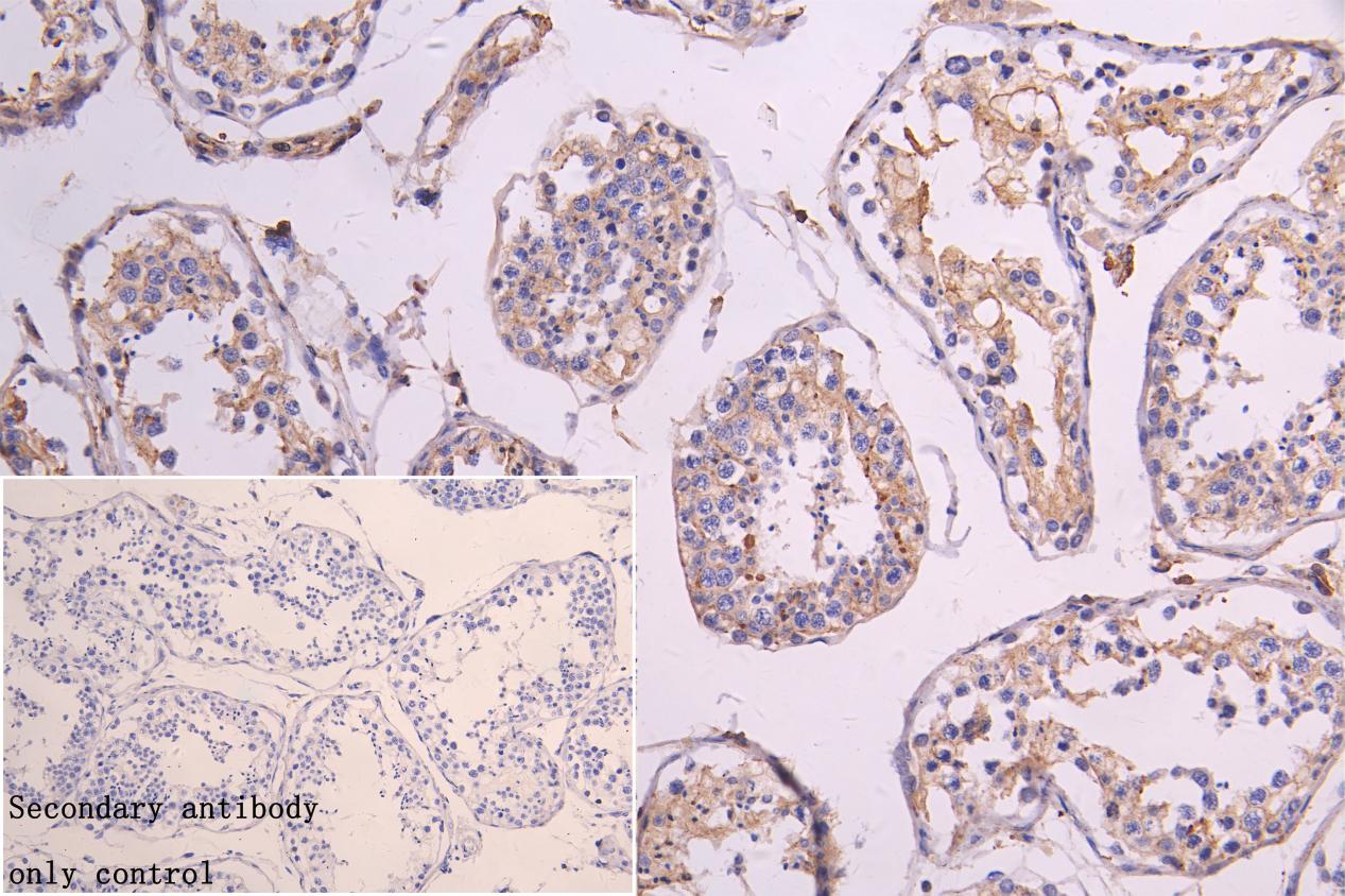 IHC image of CSB-PA012742LA01HU diluted at 1:300 and staining in paraffin-embedded human testis tissue performed on a Leica BondTM system. After dewaxing and hydration, antigen retrieval was mediated by high pressure in a citrate buffer (pH 6.0). Section was blocked with 10% normal goat serum 30min at RT. Then primary antibody (1% BSA) was incubated at 4°C overnight. The primary is detected by a Goat anti-rabbit polymer IgG labeled by HRP and visualized using 0.05% DAB. Secondary antibody only control: uses 1% BSA instead of primary antibody