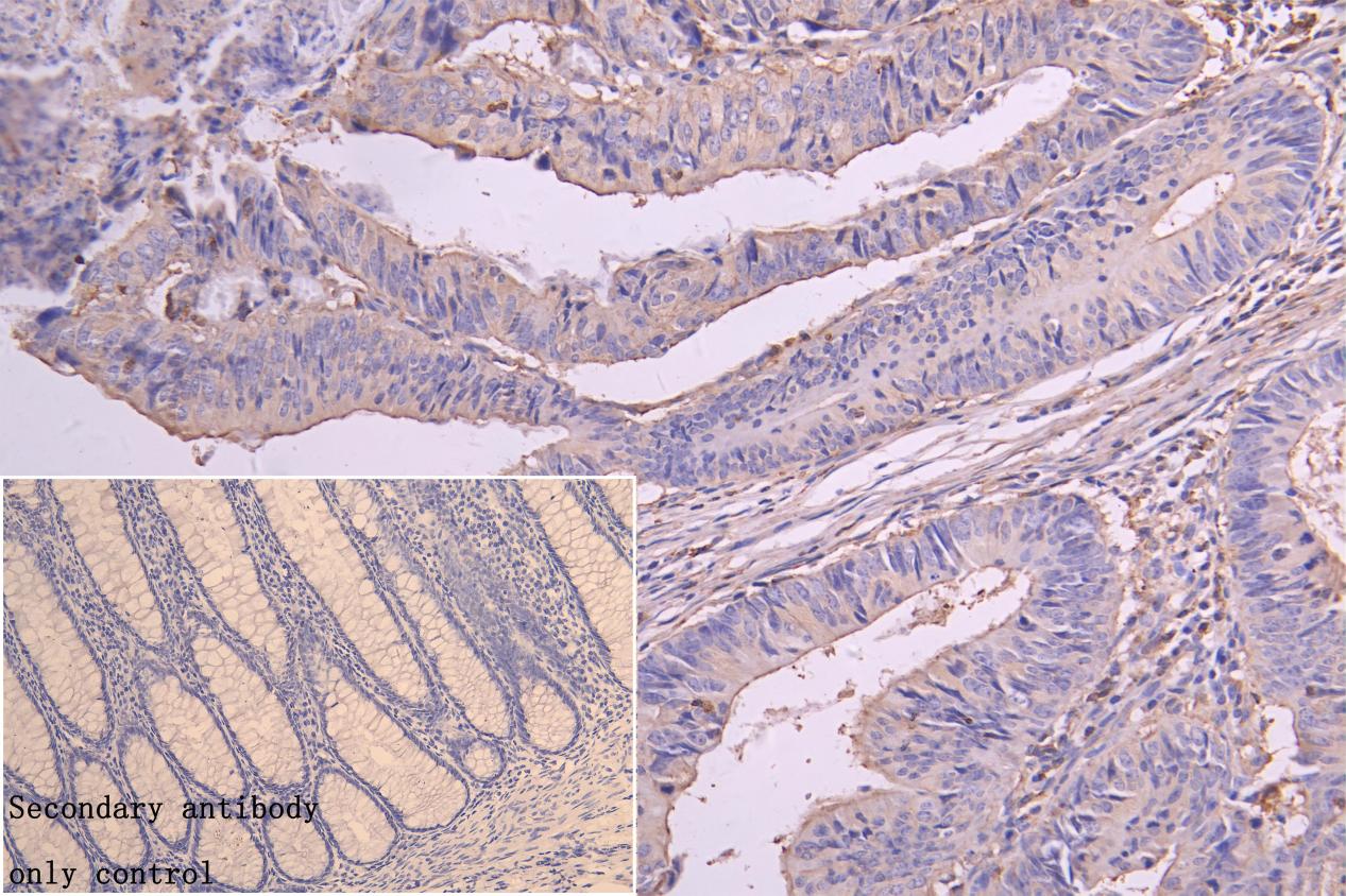 IHC image of CSB-PA012742LA01HU diluted at 1:300 and staining in paraffin-embedded human colorectal cancer performed on a Leica BondTM system. After dewaxing and hydration, antigen retrieval was mediated by high pressure in a citrate buffer (pH 6.0). Section was blocked with 10% normal goat serum 30min at RT. Then primary antibody (1% BSA) was incubated at 4°C overnight. The primary is detected by a Goat anti-rabbit polymer IgG labeled by HRP and visualized using 0.05% DAB. Secondary antibody only control: uses 1% BSA instead of primary antibody