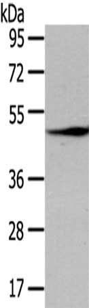 Gel: 8%SDS-PAGE,Lysate: 40 μg,,Primary antibody: CSB-PA992989(LEFTY2 Antibody) at dilution 1/200 dilution,Secondary antibody: Goat anti rabbit IgG at 1/8000 dilution,Exposure time: 30 seconds