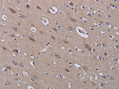 The image on the left is immunohistochemistry of paraffin-embedded Human brain tissue using CSB-PA242915(LEPREL2 Antibody) at dilution 1/40, on the right is treated with fusion protein. (Original magnification: ×200)