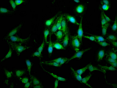 Immunofluorescence staining of Hela cells with CSB-PA012877LA01HU at 1:100, counter-stained with DAPI. The cells were fixed in 4% formaldehyde, permeabilized using 0.2% Triton X-100 and blocked in 10% normal Goat Serum. The cells were then incubated with the antibody overnight at 4°C. The secondary antibody was Alexa Fluor 488-congugated AffiniPure Goat Anti-Rabbit IgG(H+L).