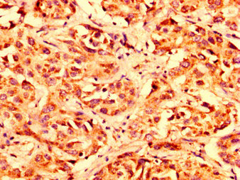 IHC image of CSB-PA012877LA01HU diluted at 1:300 and staining in paraffin-embedded human liver cancer performed on a Leica BondTM system. After dewaxing and hydration, antigen retrieval was mediated by high pressure in a citrate buffer (pH 6.0). Section was blocked with 10% normal goat serum 30min at RT. Then primary antibody (1% BSA) was incubated at 4°C overnight. The primary is detected by a biotinylated secondary antibody and visualized using an HRP conjugated SP system.