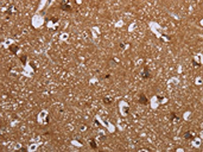 The image on the left is immunohistochemistry of paraffin-embedded Human brain tissue using CSB-PA782037(LIMK1 Antibody) at dilution 1/40, on the right is treated with synthetic peptide. (Original magnification: ×200)