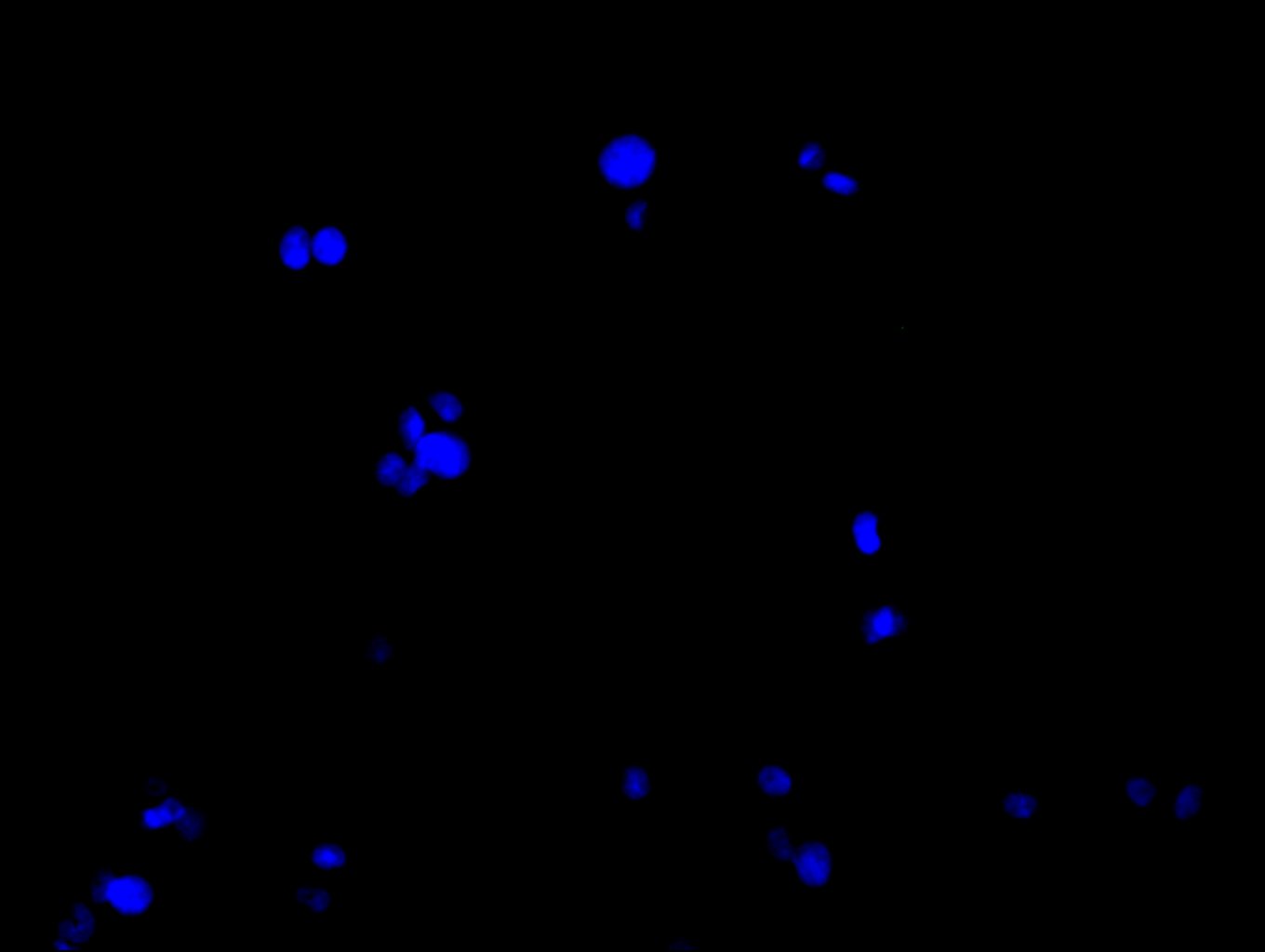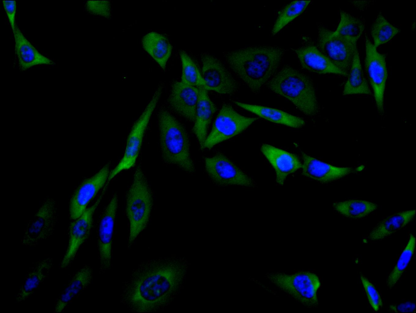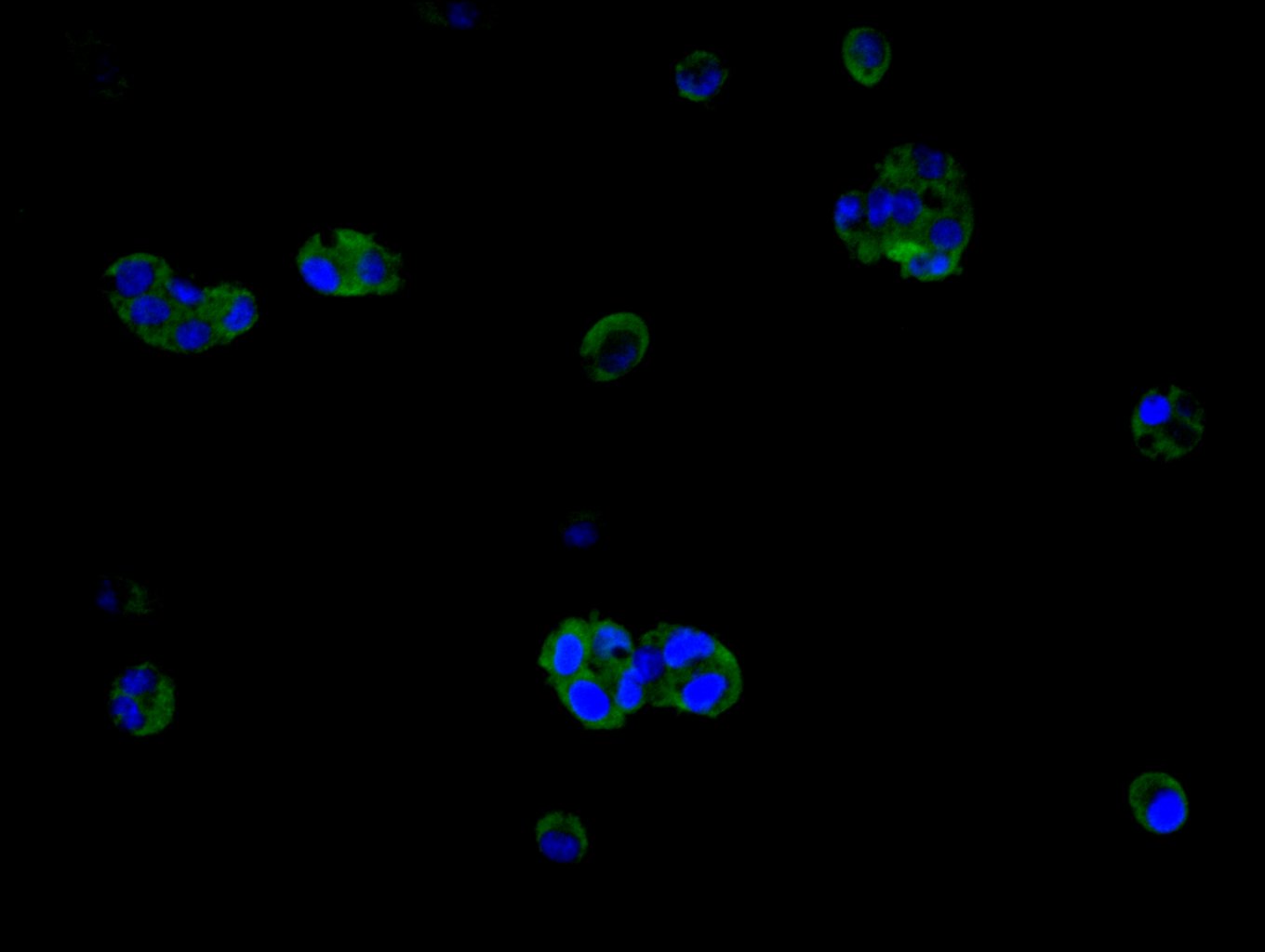 Immunofluorescence staining of PC-3 cell with CSB-PA012972EA01HU at 1:15, counter-stained with DAPI. The cells were fixed in 4% formaldehyde and and permeated by 0.2% TritonX-100 for 15 min. Then 10% normal goat serum to block non-specific protein-protein interactions . The cells were then incubated with the antibody overnight at 4℃. The secondary antibody was Alexa Fluor 488-congugated AffiniPure Goat Anti-Rabbit IgG(H+L).