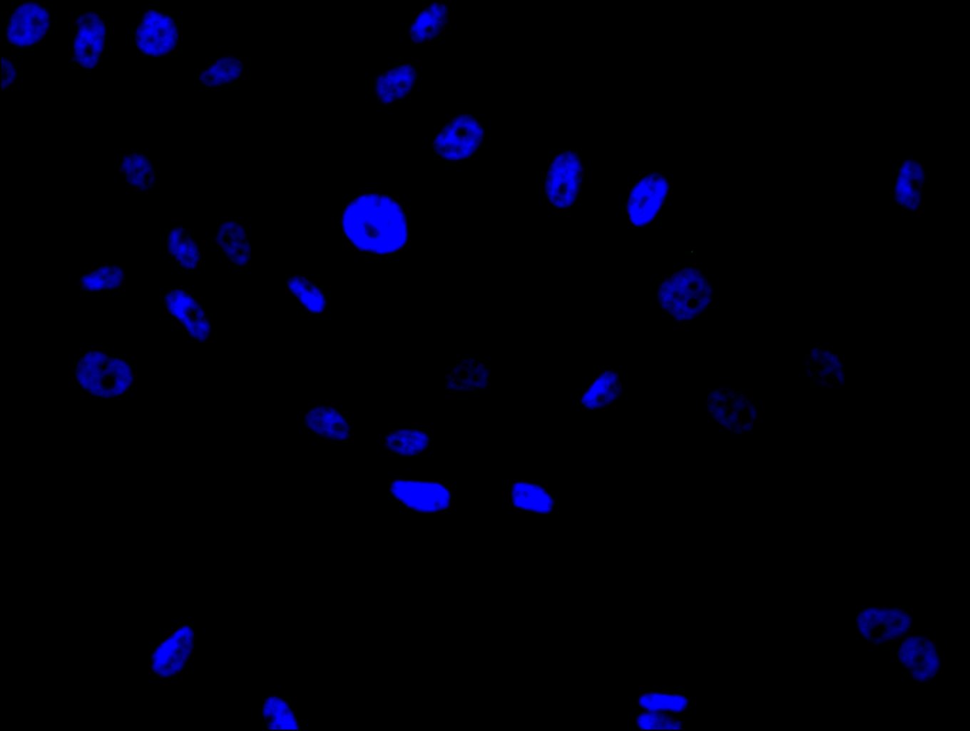 Immunofluorescence staining of HepG2 cell with 5% goat serum, counter-stained with DAPI. The cells were fixed in 4% formaldehyde and blocked in 10% normal Goat Serum. The cells were then incubated with the antibody overnight at 4C. The secondary antibody was Alexa Fluor 488-congugated AffiniPure Goat Anti-Rabbit IgG(H+L).