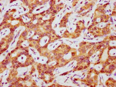 IHC image of CSB-PA012974LA01HU diluted at 1:400 and staining in paraffin-embedded human liver cancer performed on a Leica BondTM system. After dewaxing and hydration, antigen retrieval was mediated by high pressure in a citrate buffer (pH 6.0). Section was blocked with 10% normal goat serum 30min at RT. Then primary antibody (1% BSA) was incubated at 4°C overnight. The primary is detected by a biotinylated secondary antibody and visualized using an HRP conjugated SP system.