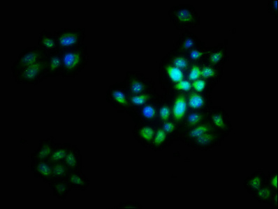 Immunofluorescence staining of PC-3 cells with CSB-PA822702LA01HU at 1:16, counter-stained with DAPI. The cells were fixed in 4% formaldehyde, permeabilized using 0.2% Triton X-100 and blocked in 10% normal Goat Serum. The cells were then incubated with the antibody overnight at 4°C. The secondary antibody was Alexa Fluor 488-congugated AffiniPure Goat Anti-Rabbit IgG(H+L).