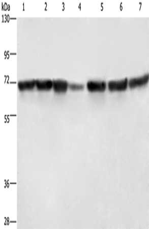Gel: 6%SDS-PAGE, Lysate: 40 μg, Lane 1-7: Hela cells, HT29 cells, human fetal liver tissue, Human testis tissue, 231 cells, K562 cells, human bladder transitional cell carcinoma tissue, Primary antibody: CSB-PA793156(LMNB1 Antibody) at dilution 1/750, Secondary antibody: Goat anti rabbit IgG at 1/8000 dilution, Exposure time: 1 second