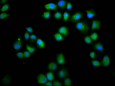 Immunofluorescence staining of Hela cells with CSB-PA823897LA01HU at 1:66, counter-stained with DAPI. The cells were fixed in 4% formaldehyde, permeabilized using 0.2% Triton X-100 and blocked in 10% normal Goat Serum. The cells were then incubated with the antibody overnight at 4°C. The secondary antibody was Alexa Fluor 488-congugated AffiniPure Goat Anti-Rabbit IgG(H+L).